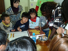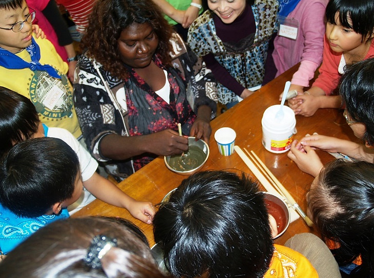 マリカさんからアボリジニの絵画方法を教わり、オーストラリアの土の絵の具を使って絵を描きました。